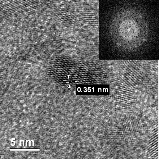 数十万倍,能看到更小的粒子 超高分辨率,每颗5nm,晶格距离0.351nm,锐钛矿型晶体